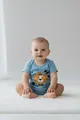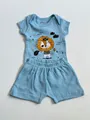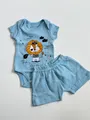 Conjunto infantil 2 peças em tecido macio: body azul com estampa de leão e bermuda shorts combinando. Cós elástico na bermuda, fechamento por botão para troca rápida e prática. Tecido suave que cuida da pele sensível, ideal para brincadeiras, passeios e sonecas com conforto o dia inteiro. Perfeito para crianças ativas e fãs de design fofo.
