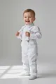 Conjunto social para bebê: camisa branca 100% algodão, suspensores ajustáveis e calça em tom neutro. Tecido macio, toque suave e caimento elegante para festas, batizados e fotos especiais. Fechamento simples para vestir com facilidade, com acabamento de qualidade que mantém a peça bonita por mais tempo. Perfeito para presentear e deixar o pequeno ainda mais fofo.