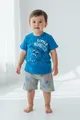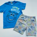 Pijama infantil composto por camiseta azul com estampa divertida de monstro e bermuda cinza com desenhos coloridos. Tecido macio, suave e respirável para conforto o dia inteiro, seja para brincadeiras, passeio ou descanso. Cós elástico garante ajuste seguro e fácil vestir. Ideal para crianças ativas que adoram estilo discreto e divertido.