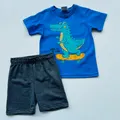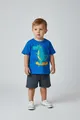 Conjunto infantil composto por camiseta azul com estampa de dinossauro sobre skate e bermuda cinza. Tecido macio, toque suave e cintura elástica que garante conforto o dia todo. Ideal para brincadeiras, passeios e atividades escolares, combina com tênis coloridos. Prático para lavar, resistente e durável, perfeito para crianças ativas que gostam de estilo e conforto.