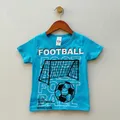 Camiseta infantil de manga curta na cor turquesa, feita em tecido macio e respirável para conforto o dia todo. Costuras reforçadas, gola redonda e estampa de futebol com gol e bola que permanece intacta após diversas lavagens. Ideal para brincadeiras, treinos ou uso escolar, combina com bermudas ou shorts. Leve, prática e durável, perfeita para pequenos fãs do esporte em qualquer ocasião.