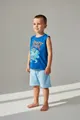 Conjunto infantil composto por camiseta azul com estampa de dinossauro e bermuda cinza. Tecido macio e respirável para o conforto das brincadeiras diárias, com costuras reforçadas que duram no dia a dia. Gola redonda e mangas short para facilitar movimentos; bermuda com cintura elástica que acompanha o crescimento. Perfeito para passeios, escola ou momentos de lazer em família.