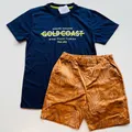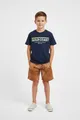 Conjunto infantil composto por camiseta azul marinho com estampa gráfica e bermuda marrom com estampa de folhas. Tecido macio, leve e respirável, para conforto o dia todo.