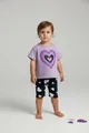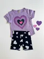 Conjunto infantil lilás com camiseta de algodão e estampa de corações sobrepostos e short azul-marinho com corações brancos. Tecido macio que respira, conforto o dia todo e costuras reforçadas para maior durabilidade. A barra do short com acabamento desfiado dá um toque atual, ideal para brincar, passear e usar na escola. Leve, prático e combinável com acessórios.
