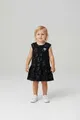 Vestido infantil preto com estampa de corações prateados. Confeccionado em tecido macio que respira, com caimento solto e saia em camadas para mobilidade e estilo. Sem mangas, ideal para dias quentes e festas, mantendo o conforto o dia todo. Ótima opção para combinar com tênis ou sapatilhas, perfeito para acompanhar a criançada em qualquer ocasião.