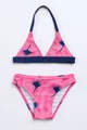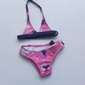 Conjunto de biquíni com estampa rosa de folhas e detalhe em azul marinho. Top triangle com alças ajustáveis e calcinha de cintura média, costuras reforçadas e tecido de secagem rápida. Conforto ao vestir, boa cobertura e ajuste seguro para brincar na praia ou piscina. Ideal para quem busca estilo moderno, qualidade e praticidade no verão.